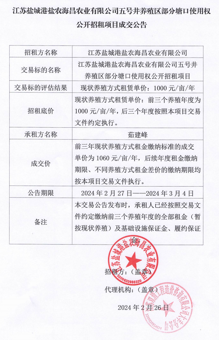 江蘇鹽城港鹽農(nóng)海昌農(nóng)業(yè)有限公司五號井養(yǎng)殖區(qū)部分塘口使用權(quán)公開招租項目成交公告