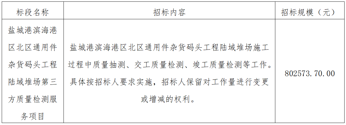 一、江蘇鹽城港濱海港開發集團有限公司負責實施的鹽城港濱海港區北區通用件雜貨碼頭工程陸域堆場第三方質量檢測服務項目已具備招標條件,項目所需資金已落實,現通過公開招標方式邀請潛在投標人參加本項目的投標。