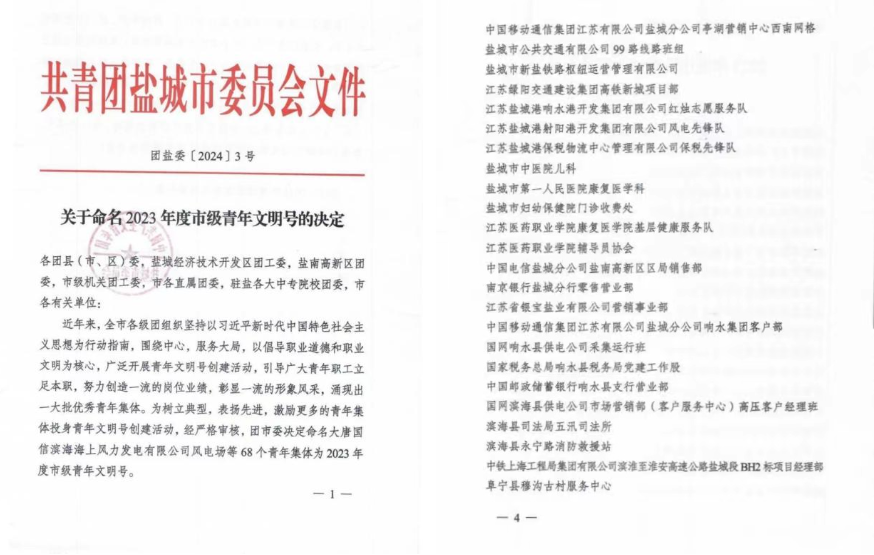 近日,共青團鹽城市委發布《關于命名2023年度市級青年文明號的決定》,集團響水港開發集團紅燭志愿服務隊、射陽港開發集團風電先鋒隊、保稅物流中心保稅先鋒隊三家集體獲評市級青年文明號稱號。