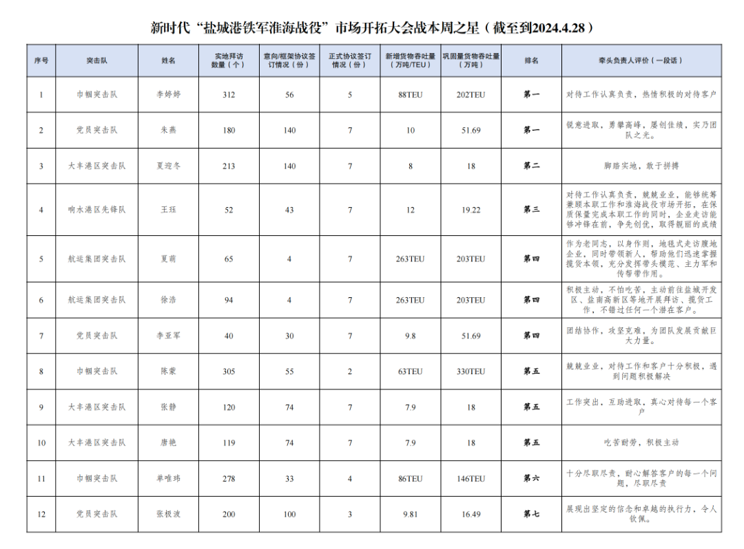 第一名:巾幗突擊隊 李婷婷(拜訪客戶312家,簽訂意向協(xié)議56份,簽訂正式協(xié)議5份,新增貨物吞吐量88TEU,鞏固量貨物吞吐量202TEU);黨員突擊隊 朱燕(拜訪客戶180家,簽訂意向協(xié)議140份,簽訂正式協(xié)議7份,新增貨物吞吐量10萬噸,鞏固量貨物吞吐量51.69萬噸)