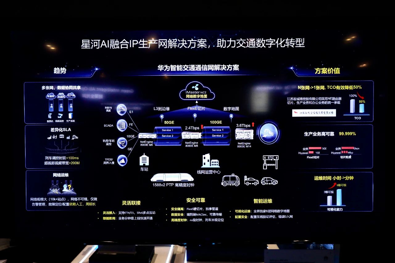 會議期間,陸帥在華為數智化展區參觀了智慧公路水運口岸展區,詳細聽取華為在港口數字化轉型和智慧港口建設等領域應用實踐情況介紹,并就數智基礎設施建設、智慧港口、智慧口岸等方面進行深入交流。參觀后,陸帥與華為全球技術服務副總裁盧煜等相關人員,就如何向智慧港口數字化轉型建設進行深入的高層交流。科技集團智能化裝備公司陳愷在《星河AI廣域網絡,加速行業數智化》分論壇分享了鹽城港IPV6+骨干網建設實踐相關案例。