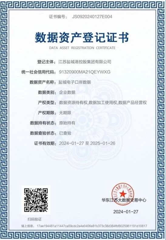 日前,鹽城電子口岸系統通過數據資產質量評價及價值評估,評估值達910萬元,并獲得《數據資產登記證書》,成為全國首個電子口岸系統數據資產入表案例。