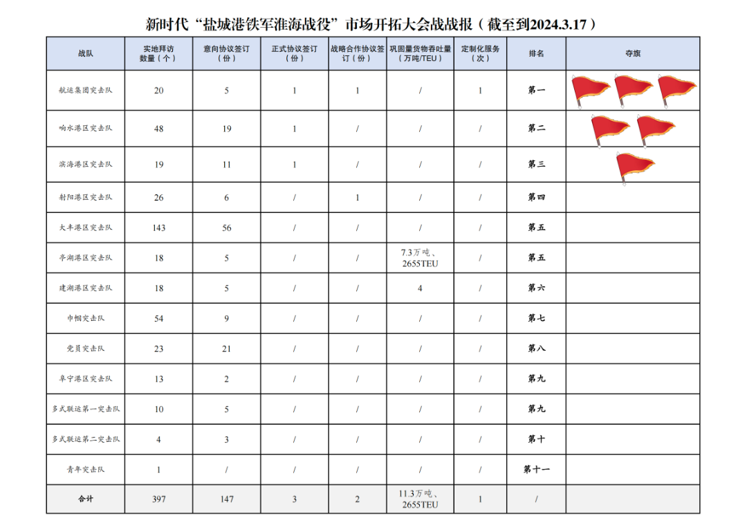 2.簽訂意向協議數量147份:其中大豐港區突擊隊56份,黨員突擊隊21份,響水港區突擊隊19份,濱海港區突擊隊11份,巾幗突擊隊9份,射陽港區突擊隊6份,航運集團突擊隊5份,亭湖港區突擊隊5份,建湖港區突擊隊5份,多式聯運第一突擊隊5份,多式聯運第二突擊隊3份,阜寧港區突擊隊2份。