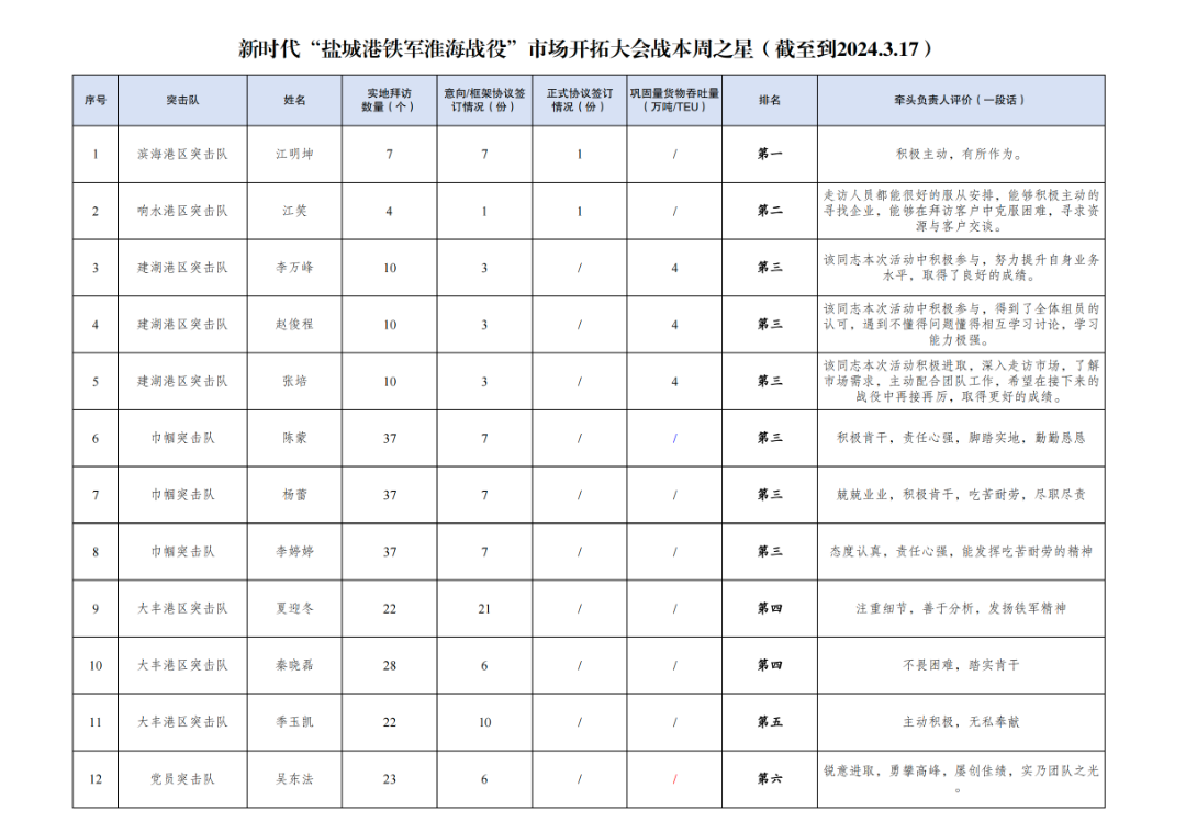 1.累計拜訪客戶數量397家:其中大豐港區突擊隊143家,巾幗突擊隊54家,響水港區突擊隊48家,射陽港區突擊隊26家,黨員突擊隊23家,航運集團突擊隊20家,濱海港區突擊隊19家,亭湖港區突擊隊18家,建湖港區突擊隊18家,阜寧港區突擊隊13家,多式聯運第一突擊隊10家,多式聯運第二突擊隊4家,青年突擊隊1家。