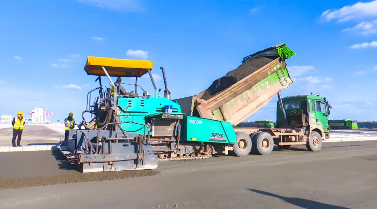 運輸車正繁忙地將水泥穩定碎石