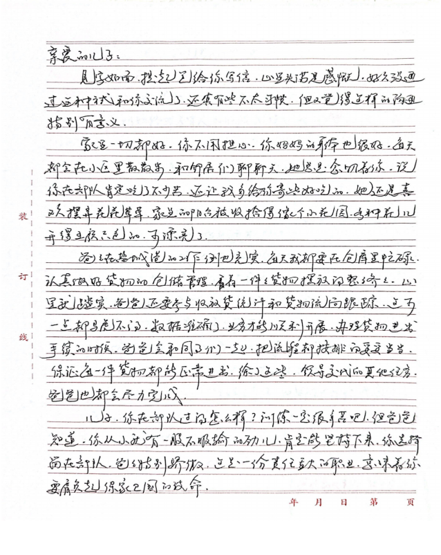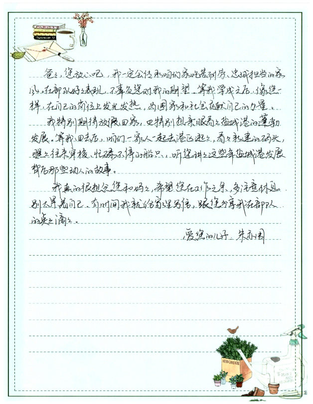 字里行間流露出對雙親的敬仰之情,細數在軍旅或職場中的成長點滴,并鄭重承諾將“忠誠、奮進”的家風薪火相傳,以實際行動回饋家庭與社會,同時深切期盼家庭團聚的美好時光。