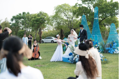 婚禮秀以“潮汐”“云端”為核心意象,將港口元素與婚禮藝術(shù)深度結(jié)合。室內(nèi)環(huán)節(jié)通過(guò)宣傳視頻展現(xiàn)“吃住行游購(gòu)?qiáng)省蔽穆卯a(chǎn)業(yè)鏈與酒店五星級(jí)服務(wù)理念,戶外秀場(chǎng)則以大提琴演奏《有海浪聲音的大提琴》、舞蹈《云與海的相遇》等沉浸式演出,打造“海風(fēng)輕拂、云影婆娑”的夢(mèng)幻氛圍。新人登場(chǎng)時(shí)以“海港”“小云”為角色設(shè)定,誓言卡融入“潮汐的港灣”“穿越云海的勇氣”等港口文化符號(hào),讓愛(ài)情敘事與港口特色交相輝映,營(yíng)造出“海天共鑒”的浪漫場(chǎng)景。