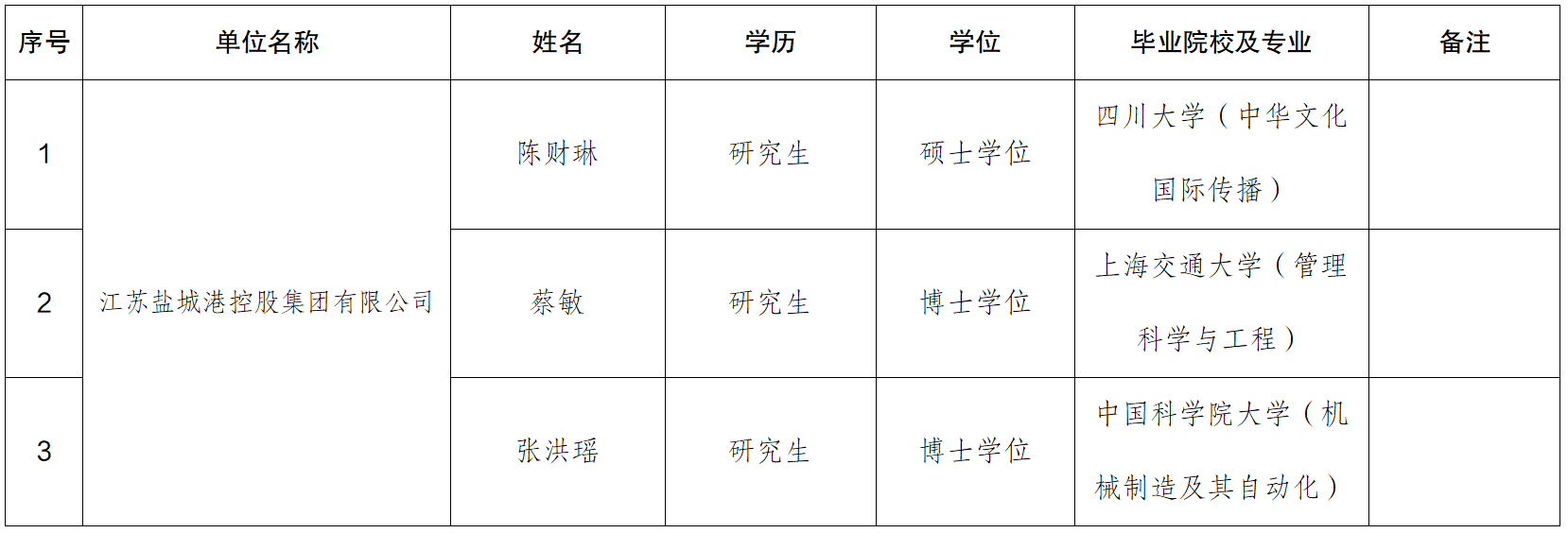 根據(jù)江蘇鹽城港控股集團(tuán)有限公司相關(guān)程序規(guī)定,現(xiàn)對3名擬錄用人員進(jìn)行公示。