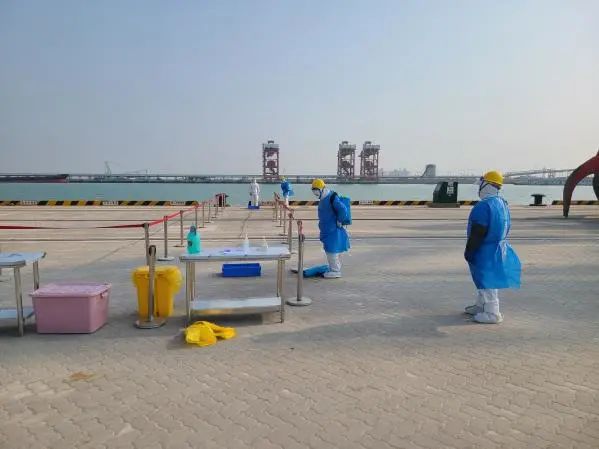 本次演練模擬了濱海港區(qū)通用碼頭2號泊位發(fā)現(xiàn)疫情之后的相關(guān)處置流程。演練中,碼頭發(fā)現(xiàn)疫情后,及時將情況進行上報,并立即停止作業(yè),同時迅速對登船人員進行排查,就地隔離,開展現(xiàn)場消殺工作。現(xiàn)場成立疫情防控應(yīng)急指揮部,按照指揮部的統(tǒng)一調(diào)度,開展應(yīng)急處置,經(jīng)過妥善處理,演練中的疫情得到有效控制,同時對碼頭作業(yè)人員嚴格執(zhí)行“N+7+7”的閉環(huán)管理,確保濱海港區(qū)碼頭盡快恢復(fù)正常生產(chǎn)。