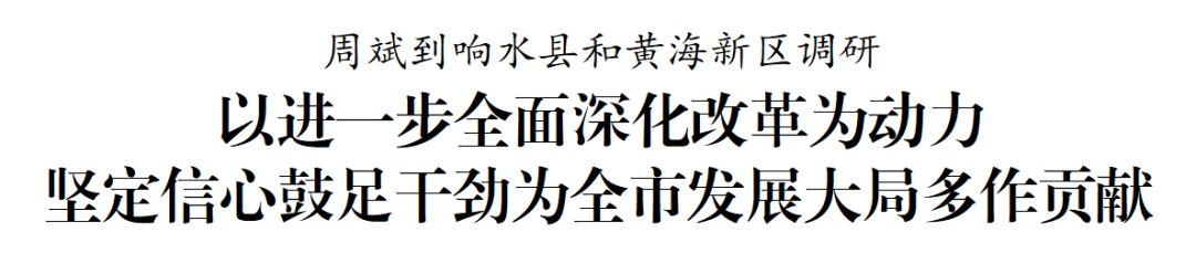 8月12日至13日,市委書記周斌到響水縣和黃海新區調研。他強調,要堅持以習近平新時代中國特色社會主義思想為指導,認真學習貫徹黨的二十屆三中全會精神,自覺把改革擺在更加突出位置,完整準確全面貫徹新發展理念,加快經濟社會發展全面綠色轉型,更好統籌發展和安全,堅定信心、鼓足干勁,努力為全市經濟發展大局多作貢獻。