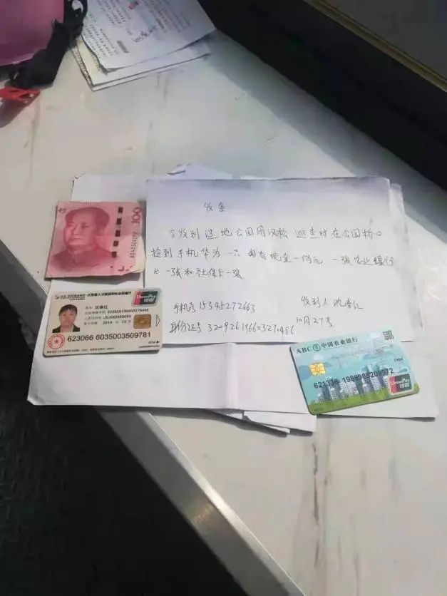 11月9日,鹽城港物業(yè)保安周漢松和往常一樣在所屬項目東郊公園內(nèi)巡邏執(zhí)勤,巡邏中發(fā)現(xiàn)馬路上“躺”著一部手機(jī),經(jīng)檢查手機(jī)外觀未損壞能亮屏,手機(jī)背面還有銀行卡、社保卡及少量現(xiàn)金。周漢松第一時間將現(xiàn)場情況進(jìn)行上報,并時刻注意著手機(jī)來電。很快便接到了外來電話,來電人自稱是失主,周漢松在電話里告知對方方位,請對方到達(dá)現(xiàn)場進(jìn)一步確認(rèn)。