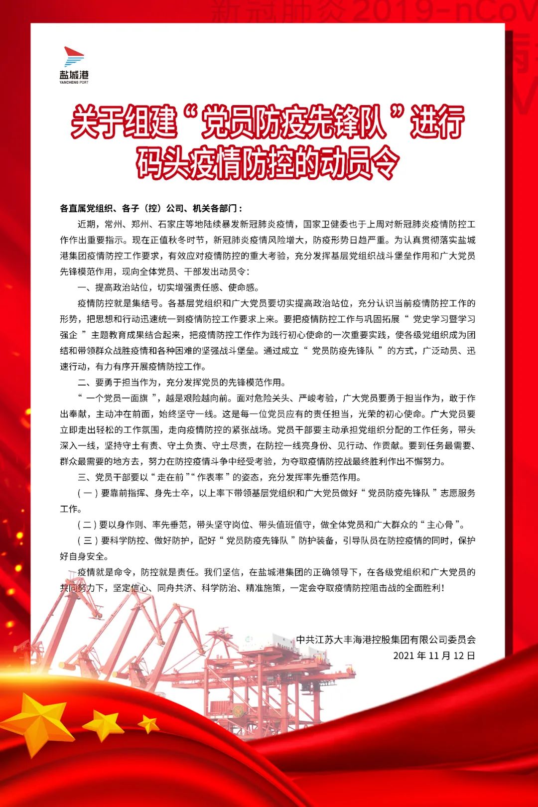 “我自愿加入港口一線黨員防疫先鋒隊(duì),提供力所能及的志愿服務(wù)……”11月15日,由大豐港區(qū)、航運(yùn)(集裝箱)集團(tuán)64名黨員組成的防疫先鋒隊(duì)向黨旗作出鄭重承諾。面對(duì)當(dāng)前疫情反復(fù)的形勢(shì),鹽城港大豐港區(qū)積極響應(yīng)“兩在兩同””建新功行動(dòng)號(hào)召,嚴(yán)格貫徹落實(shí)鹽城港集團(tuán)疫情防控工作要求,以“50天大比武”活動(dòng)為契機(jī),充分發(fā)揮“我是黨員,向我看齊”的先鋒模范作用,讓黨旗飄揚(yáng)在疫情防控最前線,確保港口生產(chǎn)、防疫“兩手抓、兩不誤”。