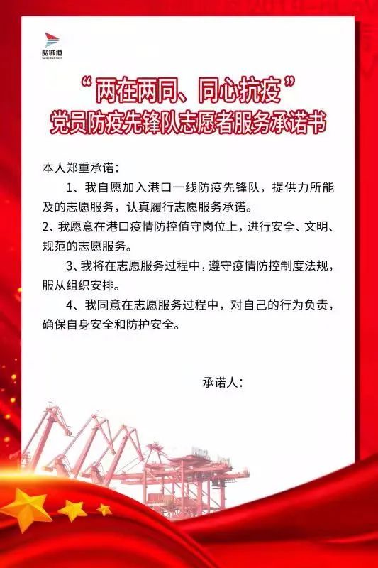 疾風(fēng)知?jiǎng)挪?,烈火見真金。疫情發(fā)生以來(lái),大豐港區(qū)迅速行動(dòng),先后成立“許鵬志愿隊(duì)”、“黨員志愿者”等隊(duì)伍,團(tuán)結(jié)帶領(lǐng)廣大黨員多次開展支援一線疫情防控工作和走訪慰問(wèn)幫扶活動(dòng),使黨員干部成為團(tuán)結(jié)和帶領(lǐng)群眾戰(zhàn)勝疫情和各種困難的“先鋒隊(duì)”和“主心骨”。集裝箱碼頭平臺(tái)上,防疫先鋒隊(duì)隊(duì)長(zhǎng)鄭重地接下“鹽城港大豐港區(qū)黨員防疫先鋒隊(duì)”鮮紅的旗幟,64名隊(duì)員依次簽署承諾書,并接受防控疫情崗前培訓(xùn),熟悉碼頭疫情防控相關(guān)知識(shí),掌握疫情處理各項(xiàng)工作步驟。這支隊(duì)伍中,來(lái)自農(nóng)業(yè)科技公司的兩名女隊(duì)員獨(dú)具“靚”點(diǎn),她們舍小家為大家,積極投身到抗疫隊(duì)伍中,為碼頭防控一線注入了光彩奪目的“巾幗力量”。