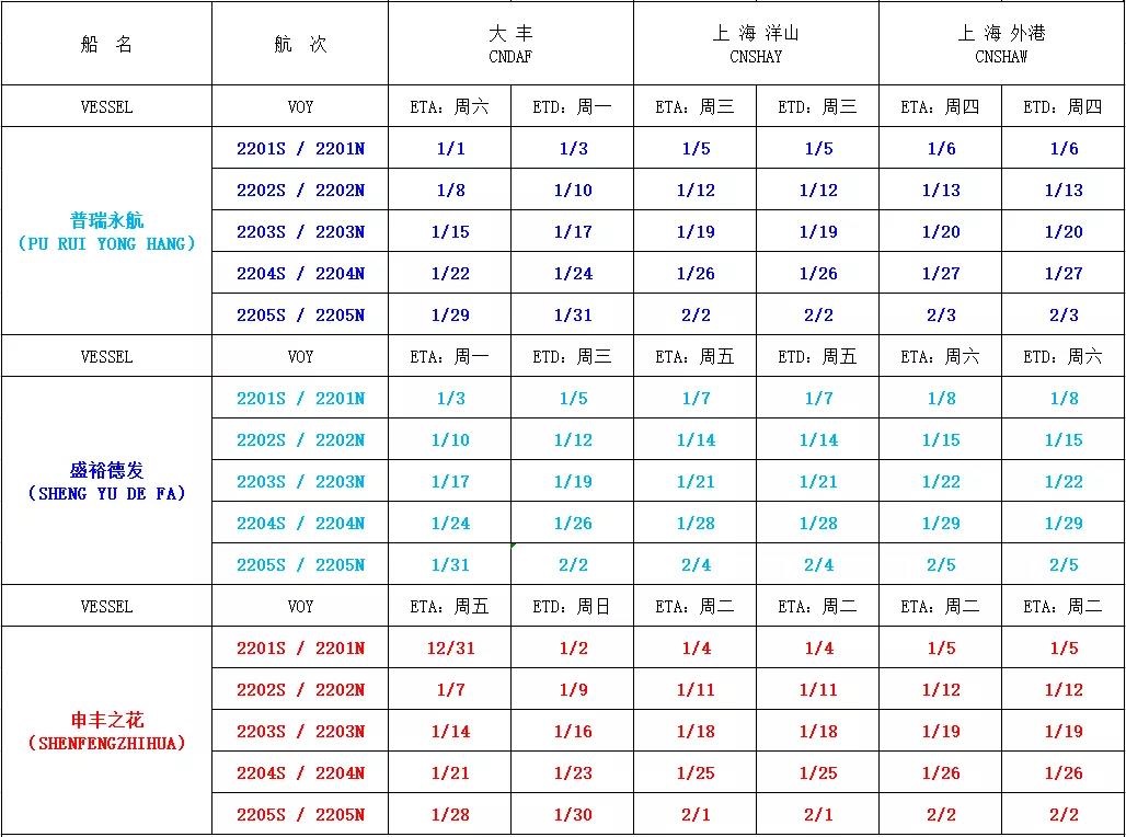 滬鹽專線2022年1月份沿海線船期表