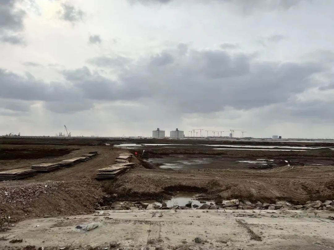 濱海港區主港池北區通用碼頭三期工程項目現場,一邊是已開工作業的國家電投集團協鑫濱海發電有限公司,一邊是聯排的挖掘機緊張施工。