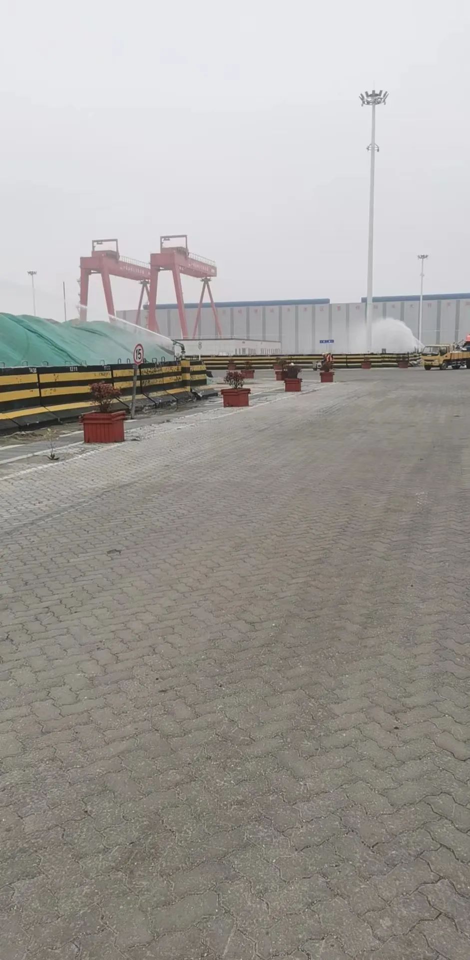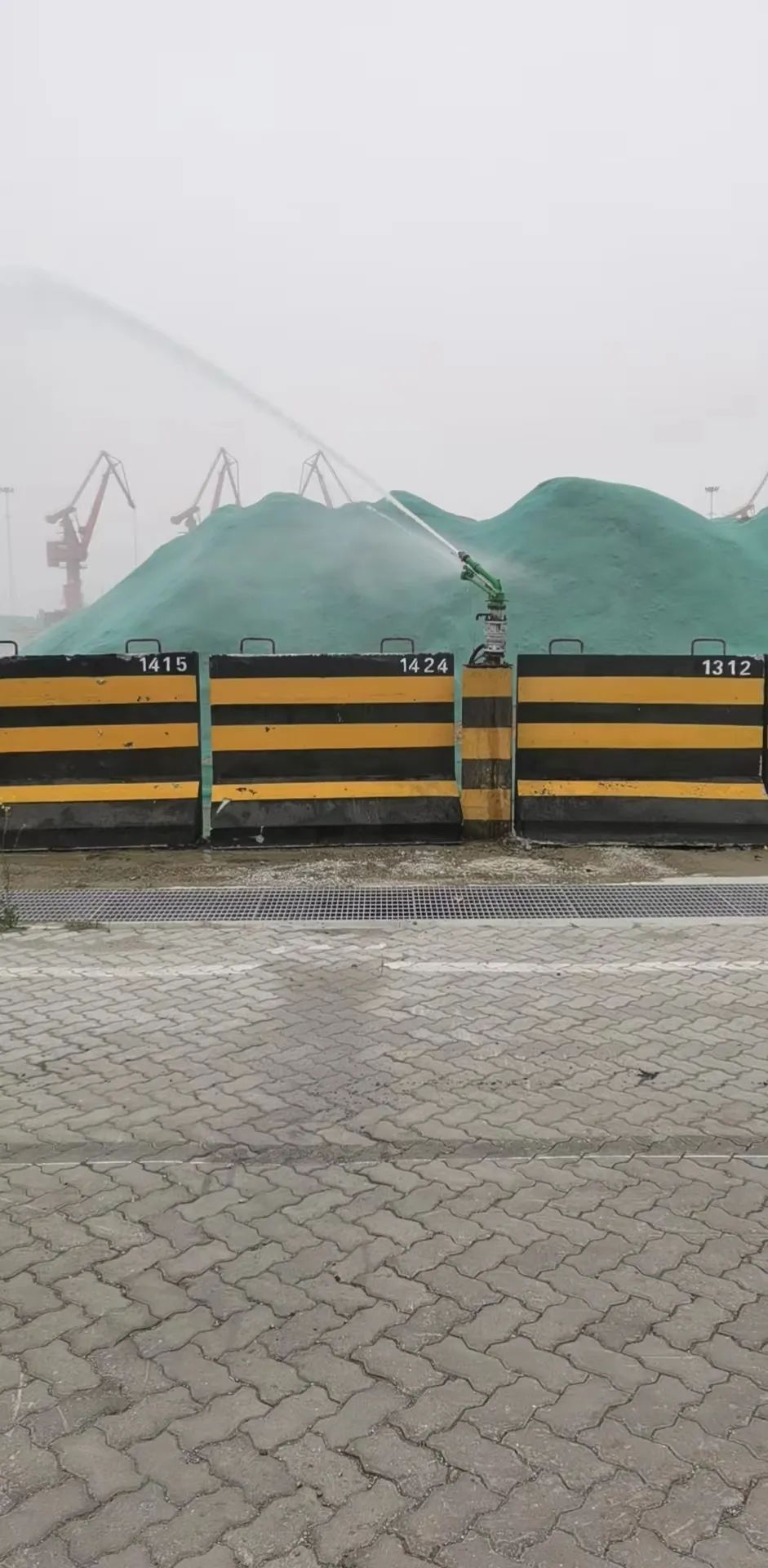 (倉儲部及時開啟堆場噴淋設備,對苫蓋貨物進行抑塵噴灑)
