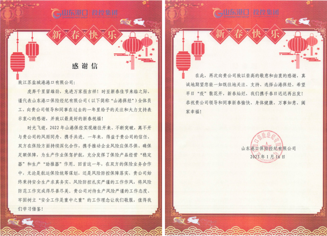 新歲序開,同赴新程。近日,集團下屬江蘇鹽城港大豐港開發集團、江蘇鹽城港港口公司、江蘇鹽城港航運集團三家單位分別收到來自山東港口保險經紀公司的感謝信。紙短情長,字字暖心。一封封感謝信,道出了鹽城港和山東港攜手發展的深厚情誼。
