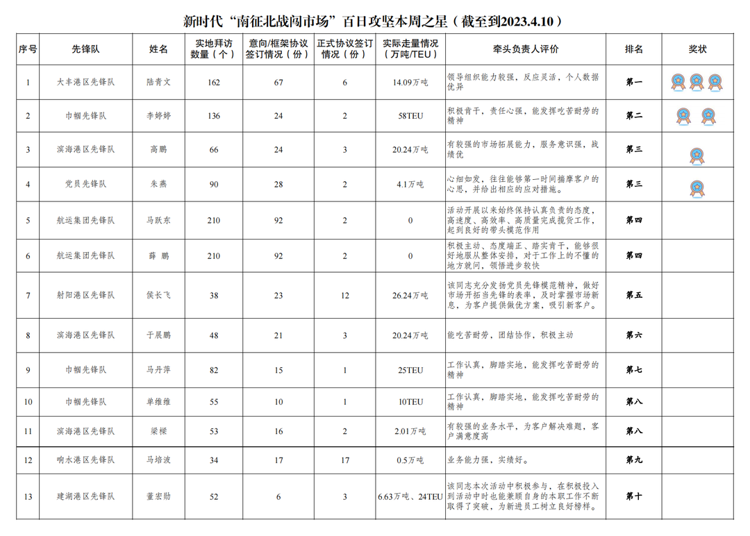 第三名:濱海港區先鋒隊 高鵬(拜訪客戶66家,簽訂意向協議24份,簽訂正式協議3份,實際走量20.24萬噸),黨員先鋒隊 朱燕(拜訪客戶90家,簽訂意向協議28份,簽訂正式協議2份,實際走量4.1萬噸)